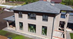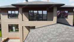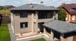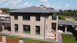 В этом доме 5 спальных комнат, кухня-гостиная и 3 санузла. Капитальные стены из газобетонных блоков. Фасад дома из клинкерного кирпича марки 250. Дом с гаражом, террасой, сауной и спортивным залом.