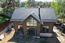 В этом доме 4 спальных комнаты, кухня-столовая, гостиная и 3 санузла. Капитальные стены из газобетонных блоков. Фасад дома из керамического кирпича с черным швом. Дом с цокольным этажом и вторым светом в гостиной.