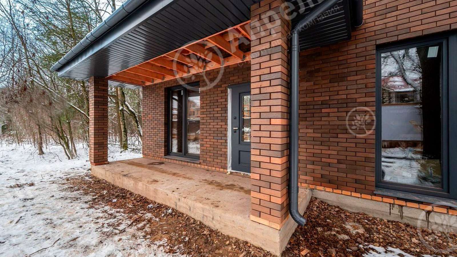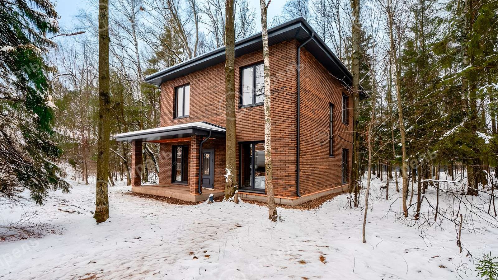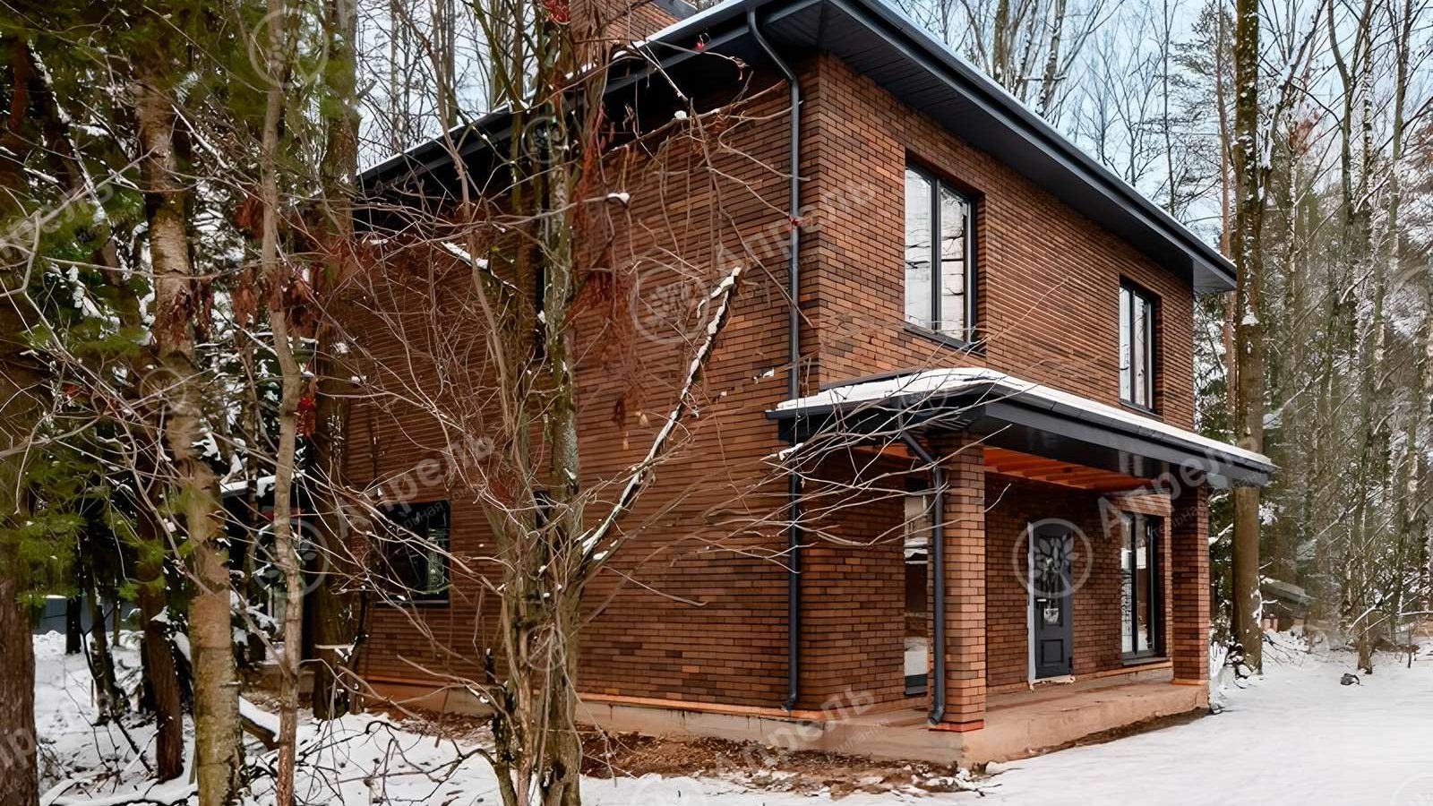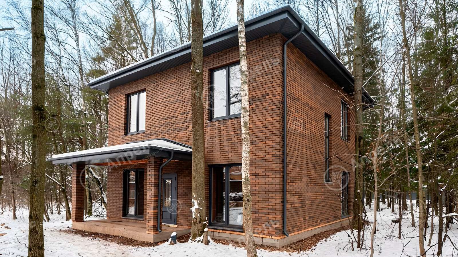 В этом доме 4 спальных комнаты, кухня-гостиная и 3 санузла. Капитальные стены из керамического блока  толщиной 380 мм + 100 мм утеплитель. Фасад дома выполнен из кирпича марки 250 в стиле баварская кладка. Терраса 25 м2 с выходом на задний двор.